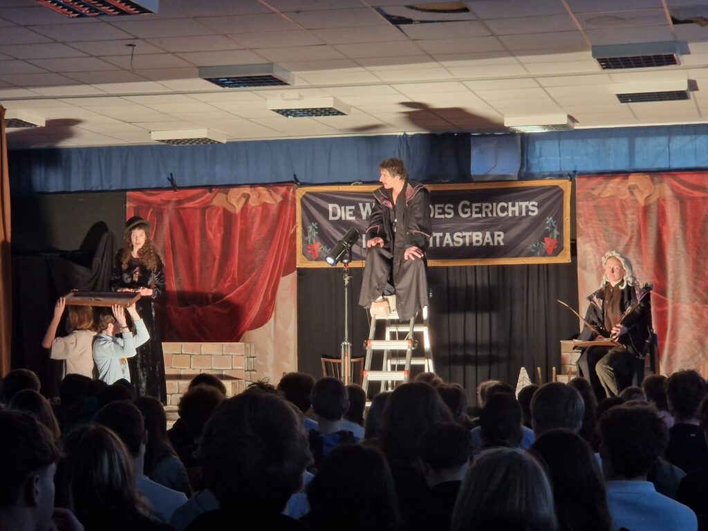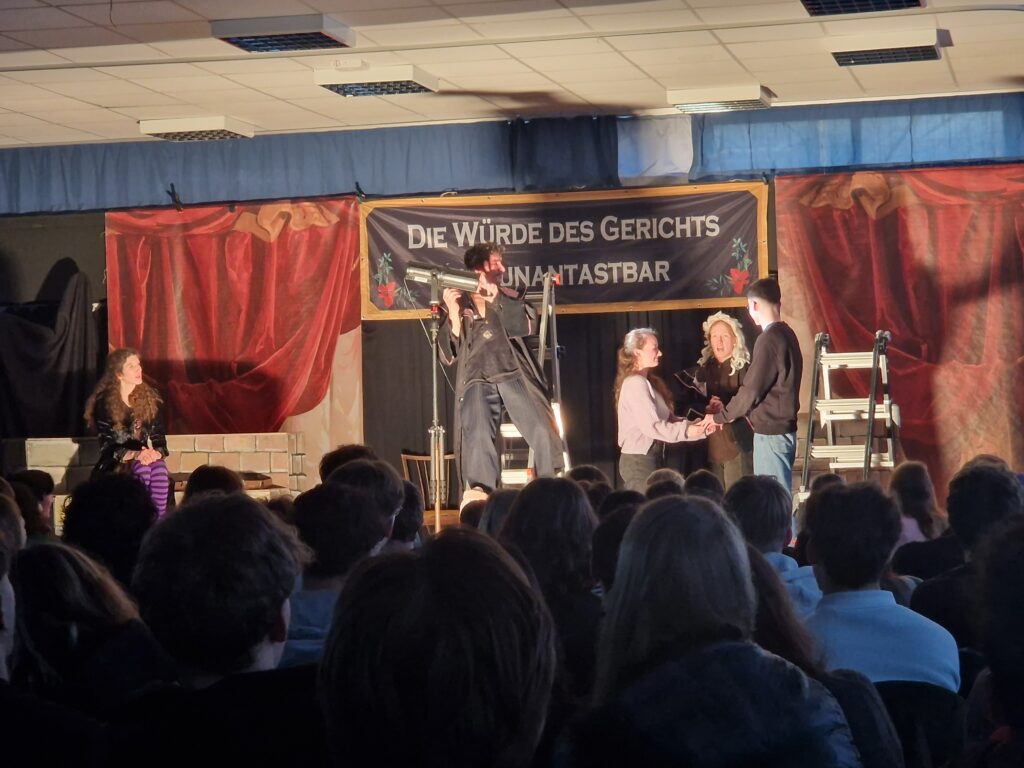 Gerade befanden wir uns noch in der kleinen Aula, einen Moment später wurden wir selbst zu einem Teil des dramatischen Gerichtsprozess: Der Protagonist und Dorfrichter Adam stolpert verwirrt und ganz uneins mit seiner eigentlichen Aufgabe, für Recht und Gerechtigkeit zu sorgen, durch die Zuschauerreihen. Sein Schreiber Licht kündigt ihm in diesem Moment auch noch einen unvorhergesehenen Besuch der Gerichtsrätin Waldtraut an, und das, gerade als Adams Perücke verschwunden ist. Das Auftreten der Klägerin verbessert diese missliche Lage kaum, Adam springt von einem Fettnäpfchen ins nächste. Erst die Befragung der ZeugInnen – Armin (S1) und Sophia (S3) schlüpften in diese Rollen – sorgt für neue Erkenntnisse und den ein oder anderen Lacher. Auch darüber hinaus wurde nicht nur für, sondern auch mit dem Publikum gespielt. Ob in der Rolle eines Tisches, des Gerichtsdieners oder als „Lichtanschalter“ wurde so manch einer ganz plötzlich in die Vorführung integriert, die in einer Abstimmung über die Schuld der Angeklagten mündete und mit einer Hochzeit der beiden ZeugInnen endete.