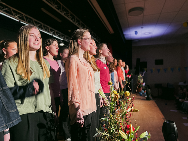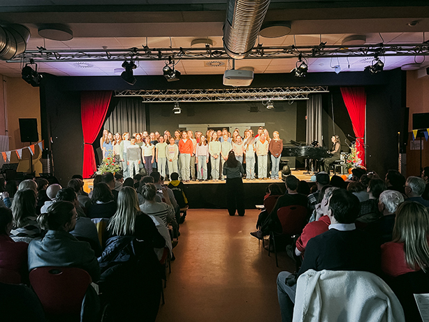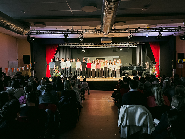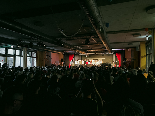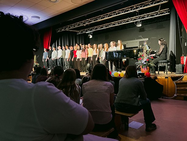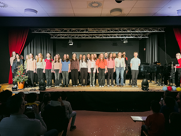 Den Auftakt gestaltete das Schulorchester – mit Sorgfalt, Spielfreude und einem Klang, der den Abend sofort in die richtige Stimmung brachte. Ein souveräner Einstieg, der das Publikum aufmerksam und gespannt zurückließ. Der Unterstufenchor brachte eine erfrischende Leichtigkeit auf die Bühne. Mit hellen Stimmen und einer spürbaren Freude am Singen überzeugten die Jüngsten das Publikum – und ernteten herzlichen Applaus. Mit dem Mittelstufenchor kam mehr Tiefe in den Abend. Die Stimmen kräftiger, das Zusammenspiel merklich gewachsen – ihr Beitrag zeigte, wie viel sich in wenigen Schuljahren musikalisch entwickeln kann. Besondere Aufmerksamkeit galt dem Oberstufenchor, der gleich in drei Besetzungen zu erleben war. S2 und S4 traten zunächst jeweils für sich auf und zeigten dabei zwei unterschiedliche, aber gleichermaßen überzeugende Interpretationen. Im gemeinsamen Auftritt beider Jahrgänge entfaltete sich dann ein voller, vielstimmiger Klang, der die Aula sichtlich berührte. Der Chor Mixtur verlieh dem Abend eine eigene, vielschichtige Note. Mehrstimmig präsentierte das Ensemble sein Programm – und hinterließ einen bleibenden Eindruck.